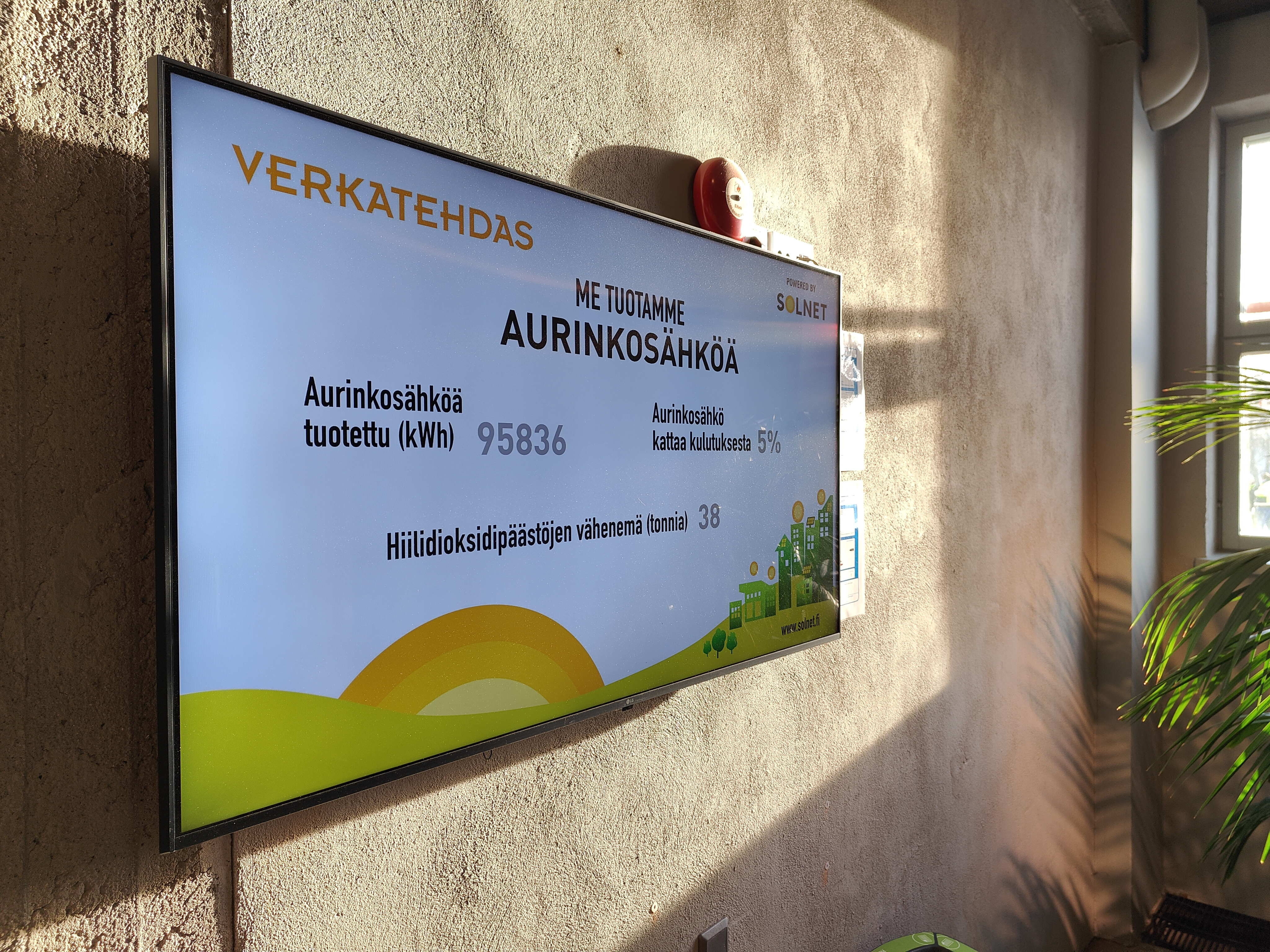 Verkatehtaan aurinkoenergian tuottoa ja hiilidioksidipäästöjen vähenemää voi seurata aulan näytöltä. KUVA Jenni Ruotsalo